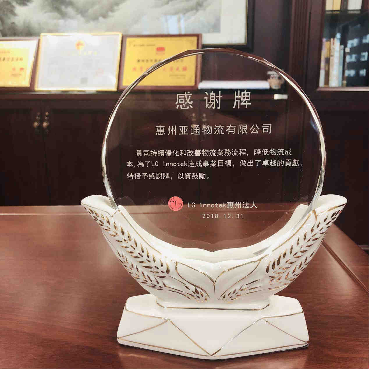 2019年1月,LG Innotek公司管理層為亞通物流有限公司頒發(fā)感謝牌,客戶的信任和肯定是我們最大的動(dòng)力和信心,亞通始終堅(jiān)持以德載物,承運(yùn)未來的原則,不斷為客戶創(chuàng)造價(jià)值,提供優(yōu)質(zhì)的服務(wù)。